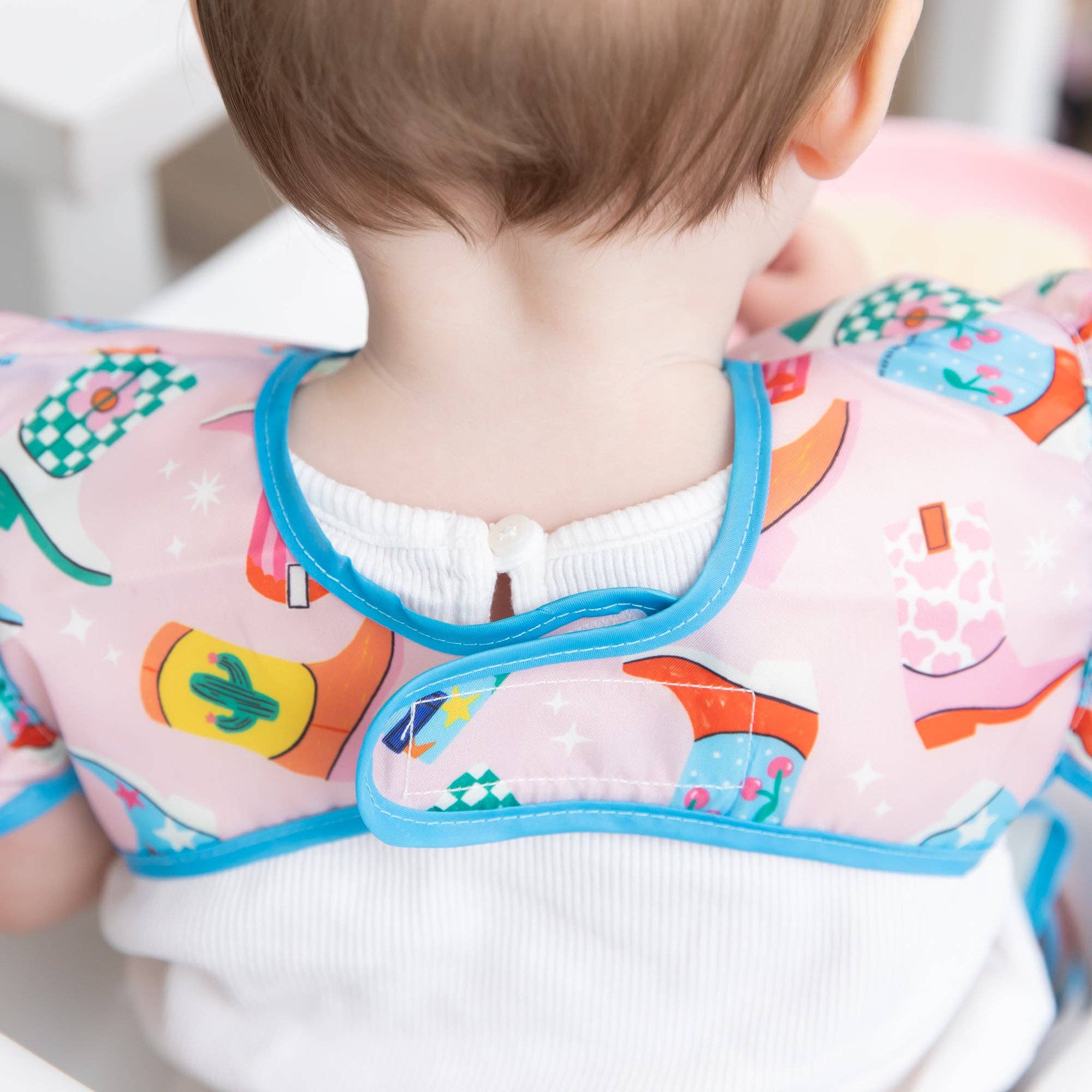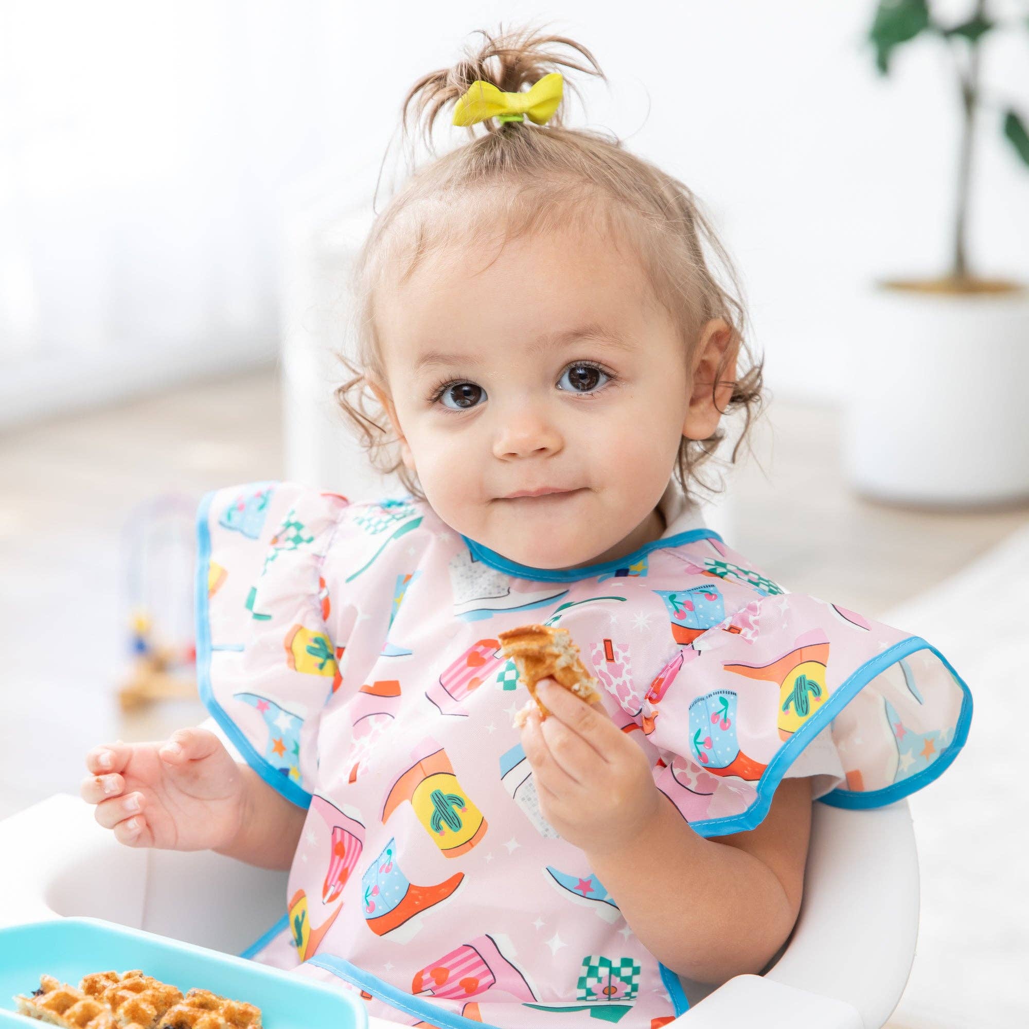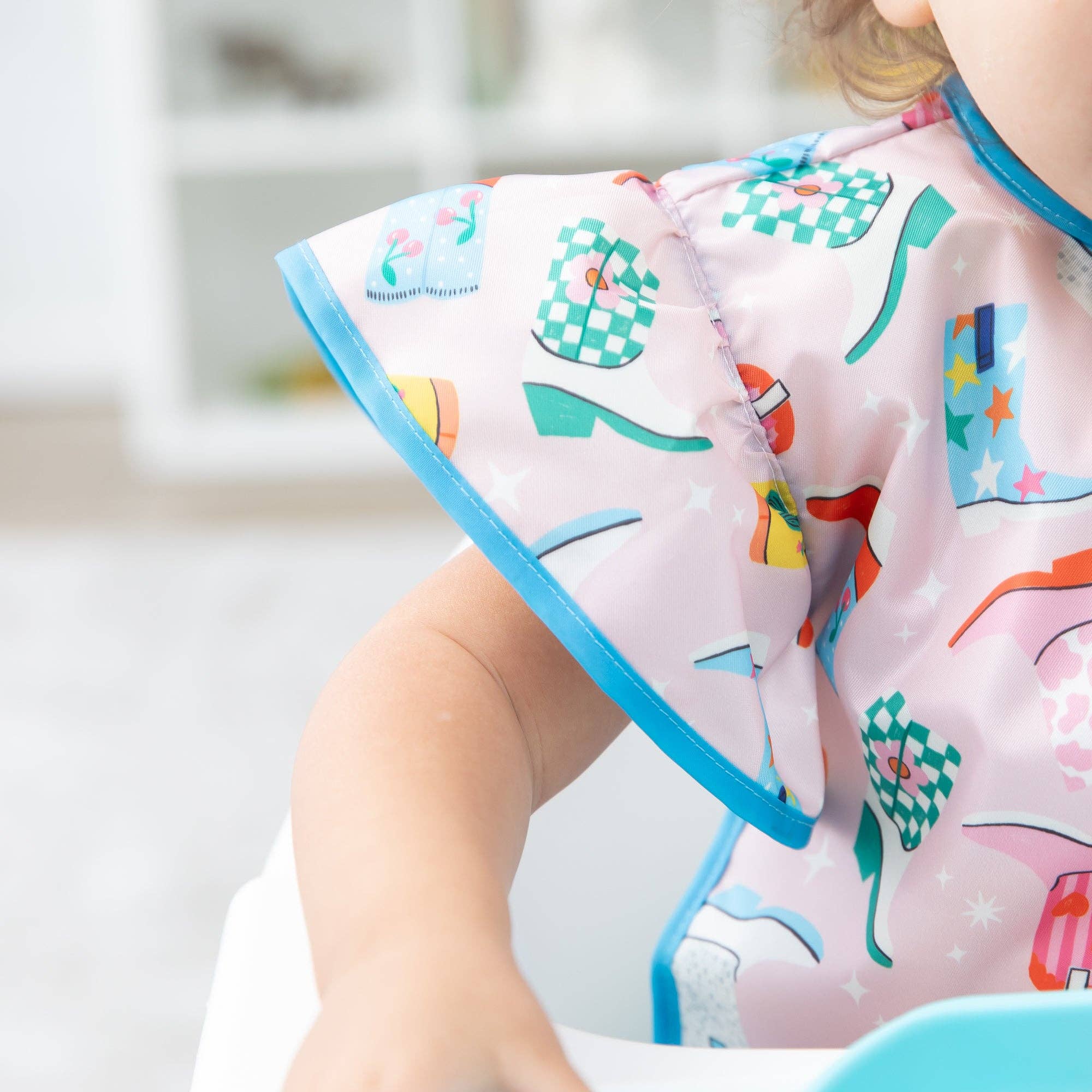 Keep mealtime mess-free with our Ruffle Apron Bib in Boots print. Crafted for both style and practicality, this adorable baby and infant bib features soft ruffles around the sleeves for a cute, feminine touch. The waterproof design ensures spills and stains stay off of clothes, while the adjustable, tug-proof hook and loop closure offers a secure fit as your little one grows. Wipeable and machine washable for easy cleaning so you can use it over and over again! Machine or hand wash; air dry completely before storing * Machine or hand wash; air dry completely before storing * 100% polyester with embedded TPU coating for waterproofing * Measures approximately 12” across the chest, 13.5” from neck down and 15” across cuff to cuff * Sized to fit ages 6 to 24 months * Safety tested using certified 3rd party labs to comply with US Federal CPSC safety regulations for Lead, Phthalates, BPA, BPS, Cadmium To extend the life of our bibs, we recommend hang drying our quick-dry fabric. Designed in Arizona, re