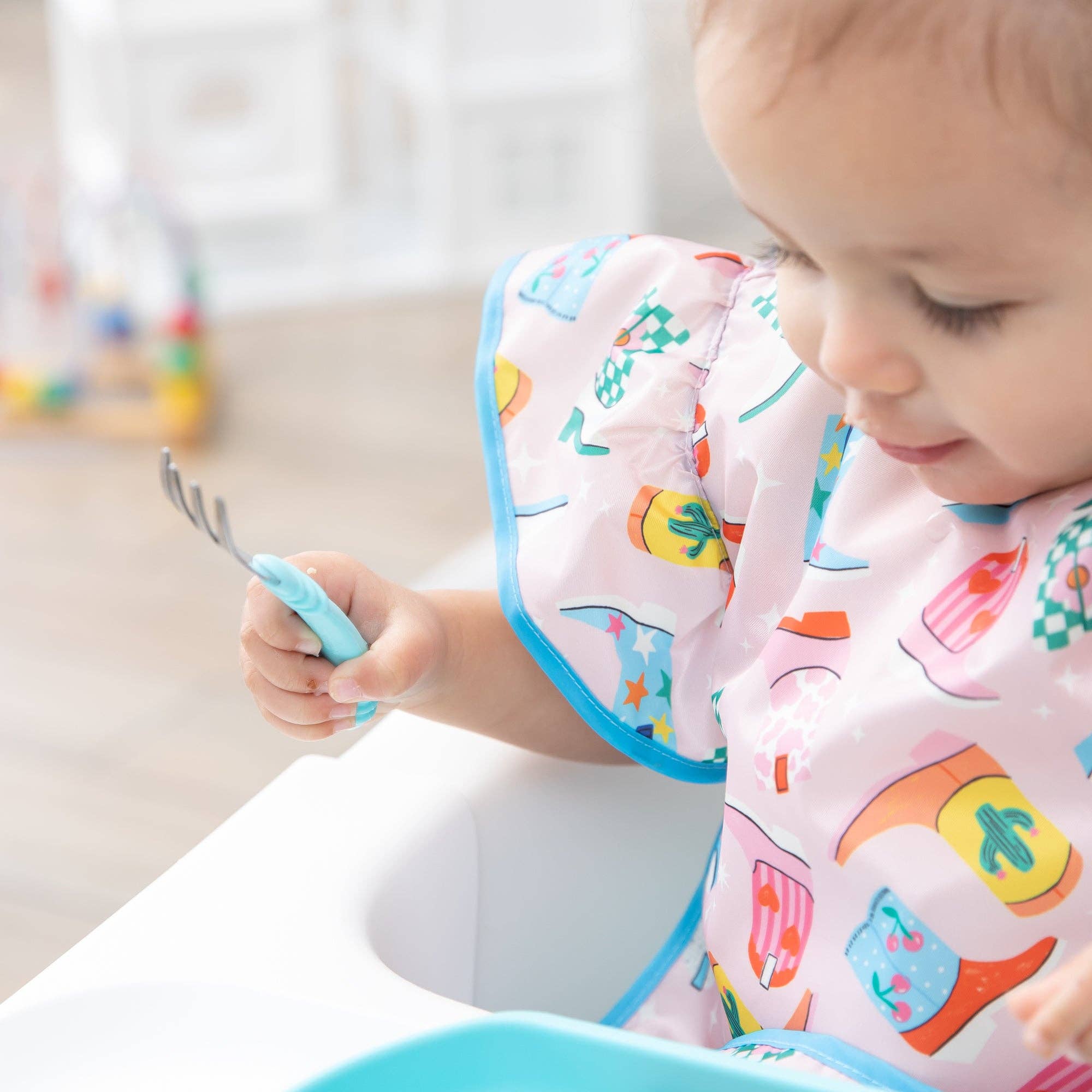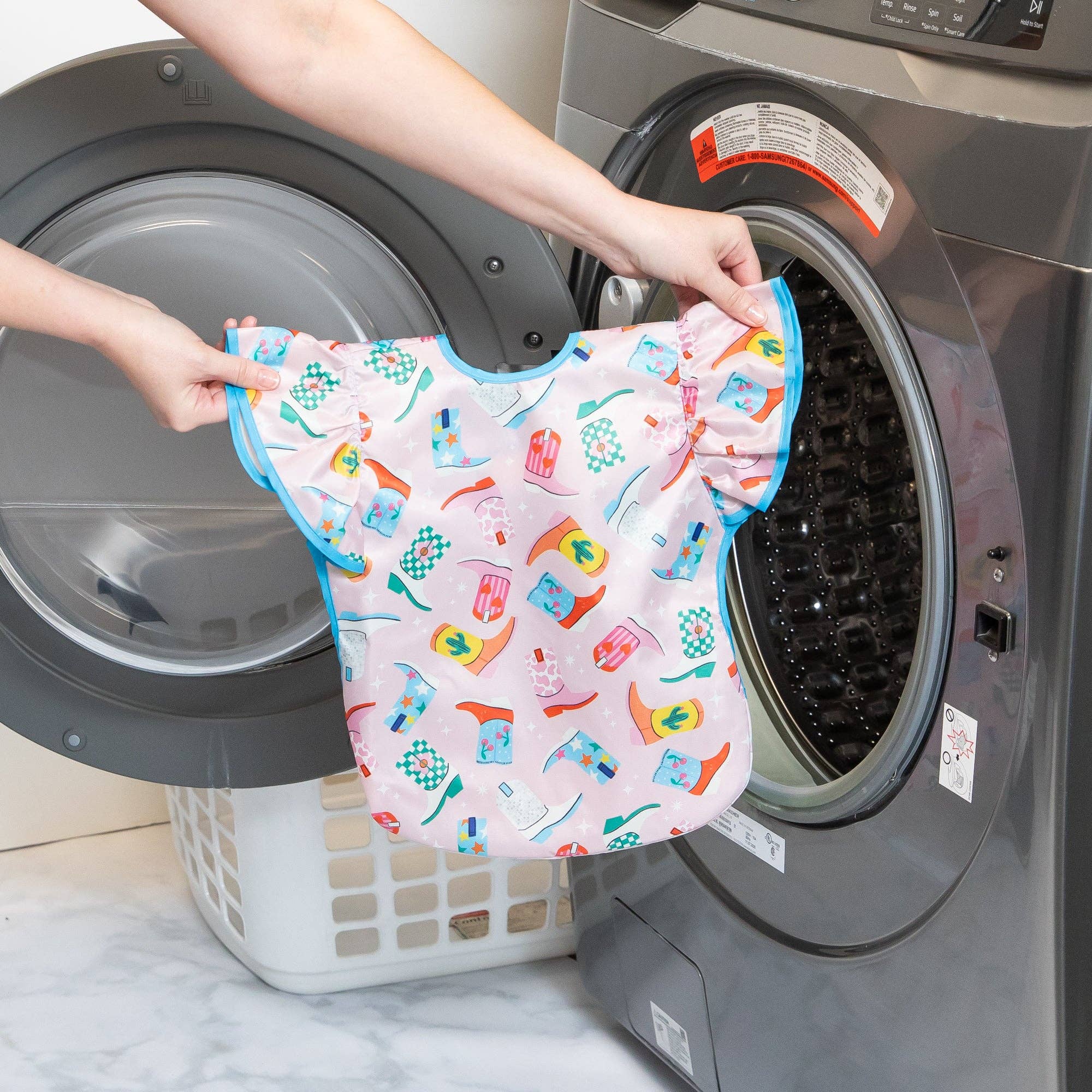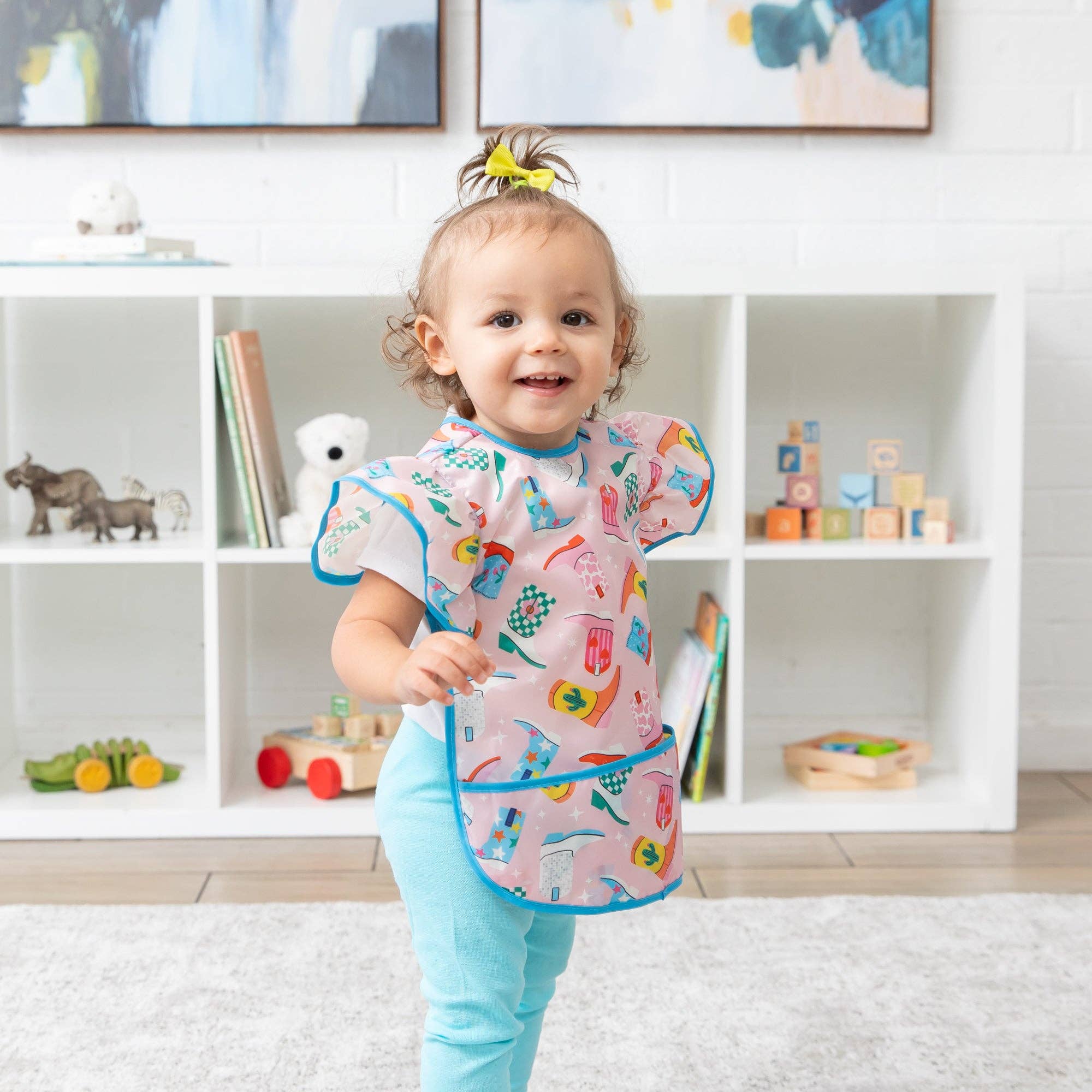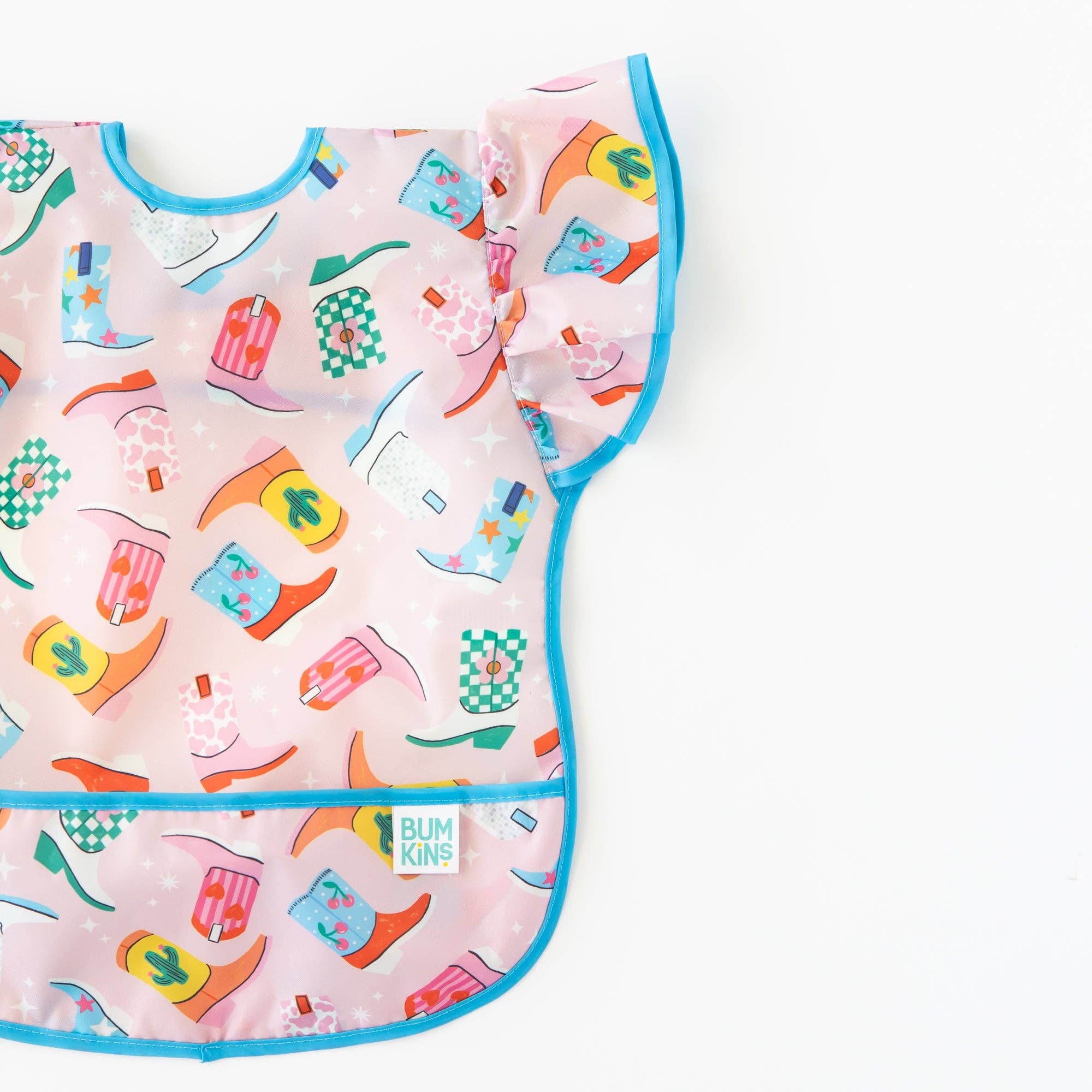 Keep mealtime mess-free with our Ruffle Apron Bib in Boots print. Crafted for both style and practicality, this adorable baby and infant bib features soft ruffles around the sleeves for a cute, feminine touch. The waterproof design ensures spills and stains stay off of clothes, while the adjustable, tug-proof hook and loop closure offers a secure fit as your little one grows. Wipeable and machine washable for easy cleaning so you can use it over and over again! Machine or hand wash; air dry completely before storing * Machine or hand wash; air dry completely before storing * 100% polyester with embedded TPU coating for waterproofing * Measures approximately 12” across the chest, 13.5” from neck down and 15” across cuff to cuff * Sized to fit ages 6 to 24 months * Safety tested using certified 3rd party labs to comply with US Federal CPSC safety regulations for Lead, Phthalates, BPA, BPS, Cadmium To extend the life of our bibs, we recommend hang drying our quick-dry fabric. Designed in Arizona, re