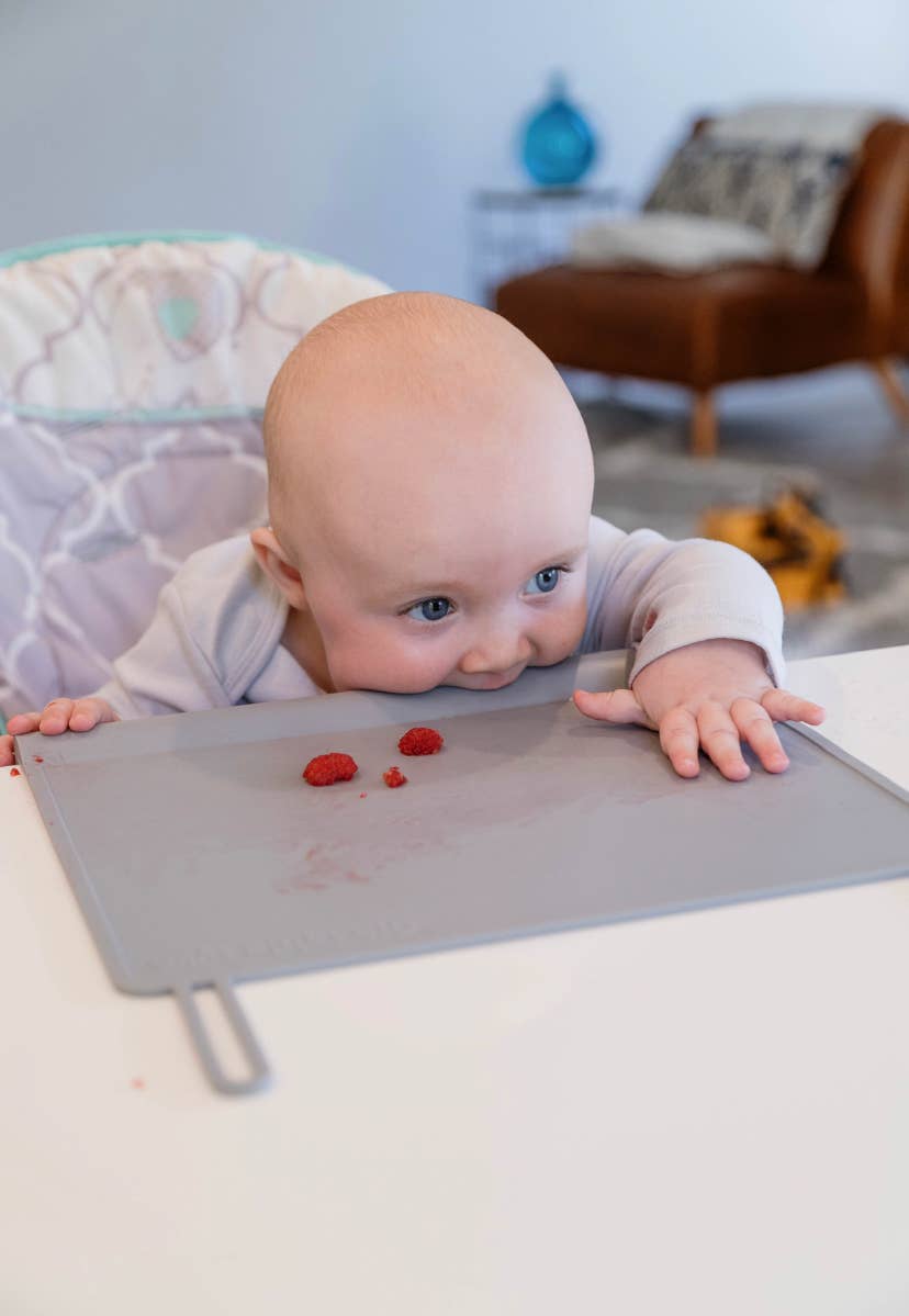 The Table Tyke Baby has suctions! This placemat, with its unique bumper protects children from table edge bumps and germs while catching spills - an essential for teething and dining out.
